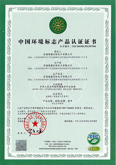 公司通過了CCC認證、節(jié)能認證、環(huán)境標志產品認證、公安部安全與警用電子產品質量檢測中心檢測報告(CNAS認證) 、ISO9001、14001、18001、CE、CB、FCC、ROHS、抗震防塵等多項資質認證,并入選《政采節(jié)能產品清單》。